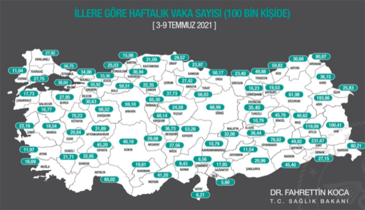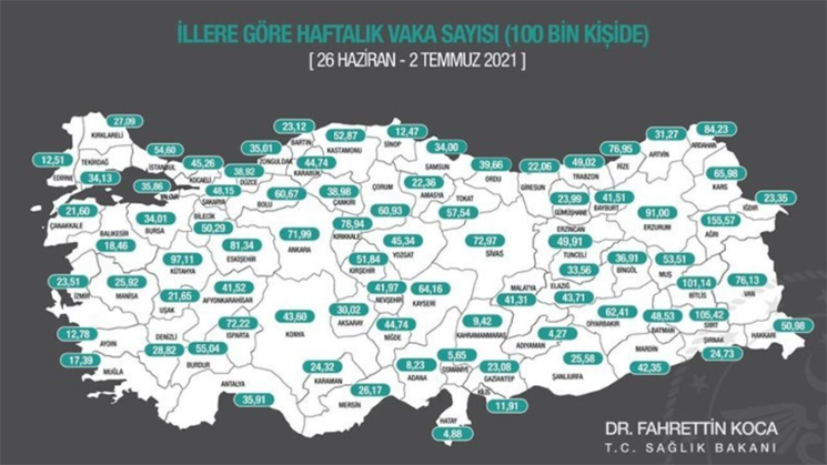 Sağlık Bakanı Fahrettin Koca basın açıklamasında, Türkiye genelinde toplam 36 ilde 750 kişide delta varyantının görüldüğünü, delta plus varyantında ise 3 ilde 3 vakanın tespit edildiğini açıkladı. İllerde 100 bin nüfusa karşılık gelen bir haftalık toplam vaka sayısını gösteren haritaya göre,26 Haziran ve 2Temmuz’da Mersin’de vaka sayısı yüz binde 26,17 iken, 3 ve 9 Temmuz’da yüz binde 41,20’ye yükseldi. Mersin Tabip Odası Başkanı Mehmet Antmen pandeminin devam ettiğine dikkat çekerek, “Pandemi devam ettiği için maskeleri asla çıkarılmaması gerekiyor. Sosyal mesafe ve hijyen kurallarına uymalıyız” dedi.