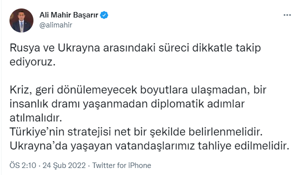 Rusya’nın Ukrayna’ya saldırmasından sonra CHP Mersin Milletvekili Ali Mahir Başarır, Rusya ve Ukrayna arasındaki süreci dikkatle takip ettiklerini söyledi. Sosyal medya hesabında paylaşım yapan Başarır, paylaşımda şu ifadelere yer verdi;