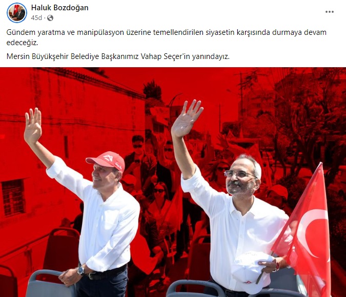 Başkan Seçer’e son zamanlarda aralarının pek iyi olmadığı bilinen Tarsus Belediye Başkanı Haluk Bozdoğan sosyal medya hesabından destek mesajı yayınladı ve yanında olduğunu söyledi. Bozdoğan, Seçer’le beraber oldukları bir fotoğrafı paylaşıp şu mesajı yayınladı; “Gündem yaratma ve manipülasyon üzerine temellendirilen siyasetin karşısında durmaya devam edeceğiz. Mersin Büyükşehir Belediye Başkanımız Vahap Seçer'in yanındayız.” (Haber Merkezi)